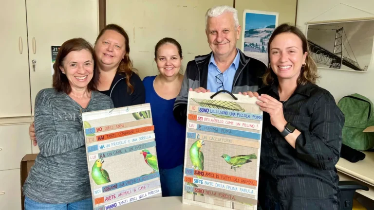 Quando visitamos em Morro Grande a Escola Municipal de Ensino Fundamental Dário Crepaldi, em julho de 2024, a nossa equipe foi recebida por uma acolhida tão afetuosa quanto festiva: a escola toda estava repleta de obras de arte produzidas pelas crianças. Cada uma das turmas, com a orientação das professoras, realizou uma forma única de releitura artística. Os trabalhos ficaram tão fabulosos quanto a história da nossa felina!