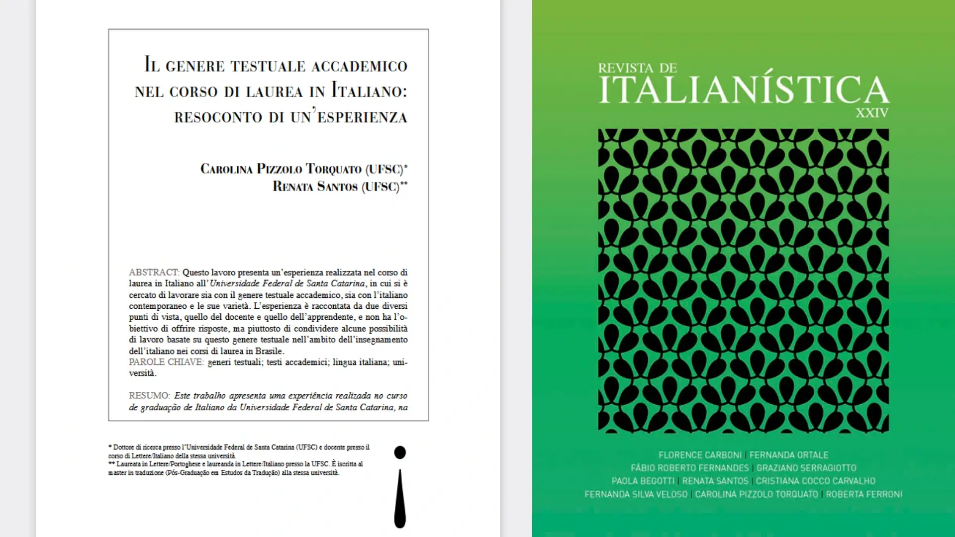 Questo lavoro presenta un’esperienza realizzata nel corso di laurea in Italiano all’Università Federale di Santa Catarina, in cui si è cercato di lavorare sia con il genere testuale accademico, sia con l’italiano contemporaneo e le sue varietà. L’esperienza è raccontata da due diversi punti di vista, quello del docente e quello dell’apprendente, e non ha l’obiettivo di offrire risposte, ma piuttosto di condividere alcune possibilità di lavoro basate su questo genere testuale nell’ambito dell’insegnamento dell’italiano nei corsi di laurea in brasile.