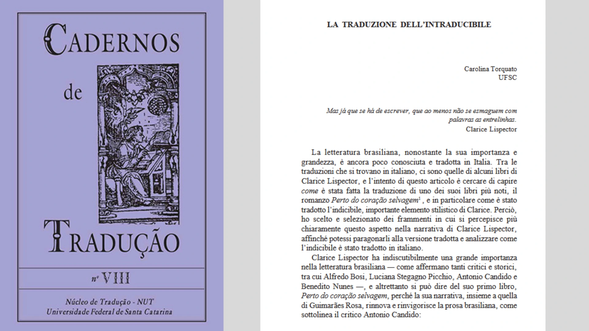 Publicado nos Cadernos da tradução, o artigo “La traduzione dell’intraducibile” trata da tradução italiana do romance “Perto do coração selvagem”, de Clarice Lispector.