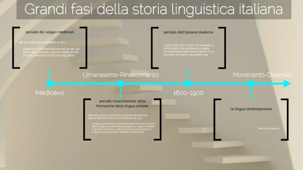 A Itália é um país plurilíngue: além do italiano, muitas outras línguas e dialetos são falados no território italiano. Para compreender as origens dessa grande diversidade linguística presente na Itália, é preciso conhecer a história da língua italiana. Nessa apresentação, são retomadas as principais fases da história da língua italiana, desde as suas origens medievais aos dias atuais.