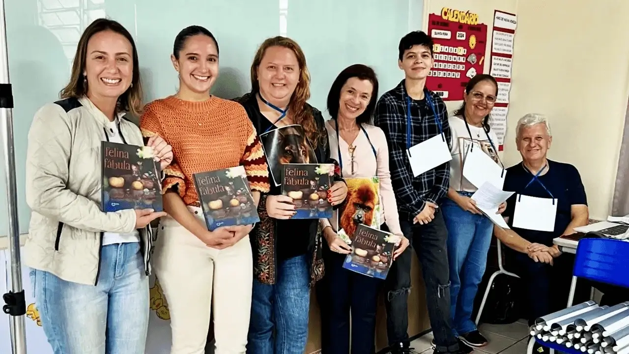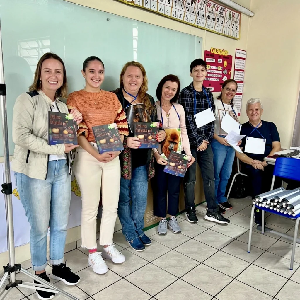 Nós viajamos centenas de quilômetros para apresentar a “Felina fábula” nas escolas! Começamos as nossas viagens em equipe para a contação do livro em 2023 e, desde então, foram muitas aventuras e um imenso aprendizado, em todos os sentidos.